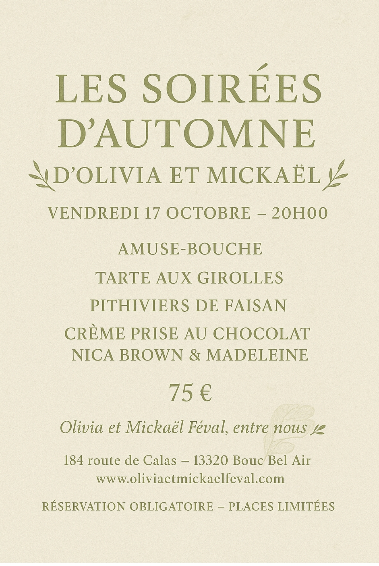 Les dîners d’Olivia & Mickaël- soirée spéciale – 17 octobre 2025